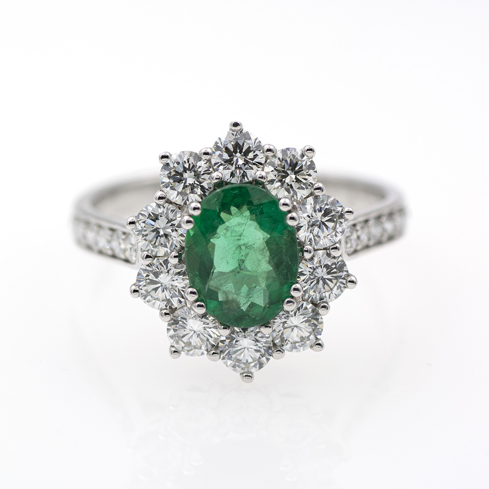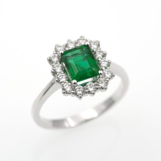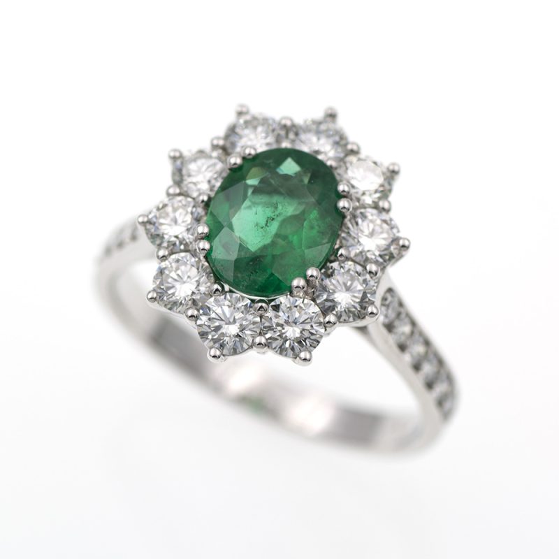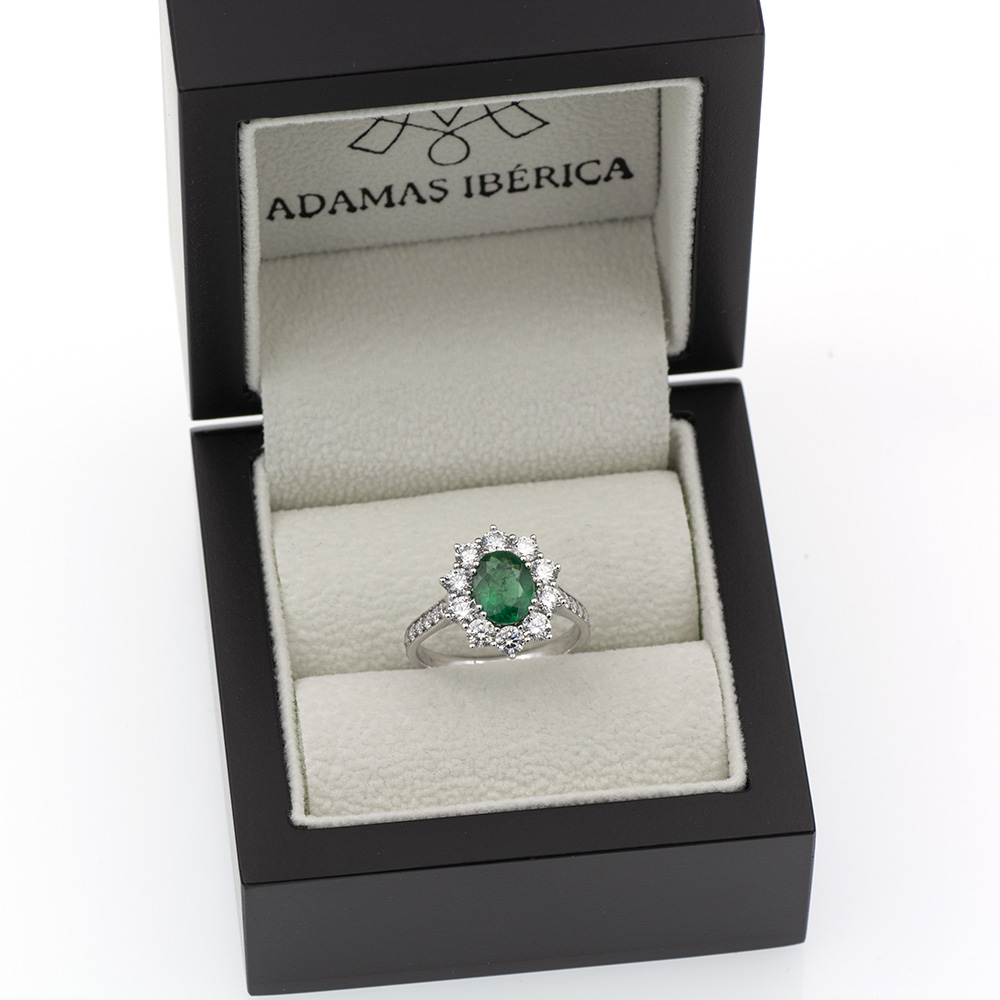 Anillo exclusivo de oro blanco con una esmeralda y diamantes.
