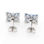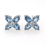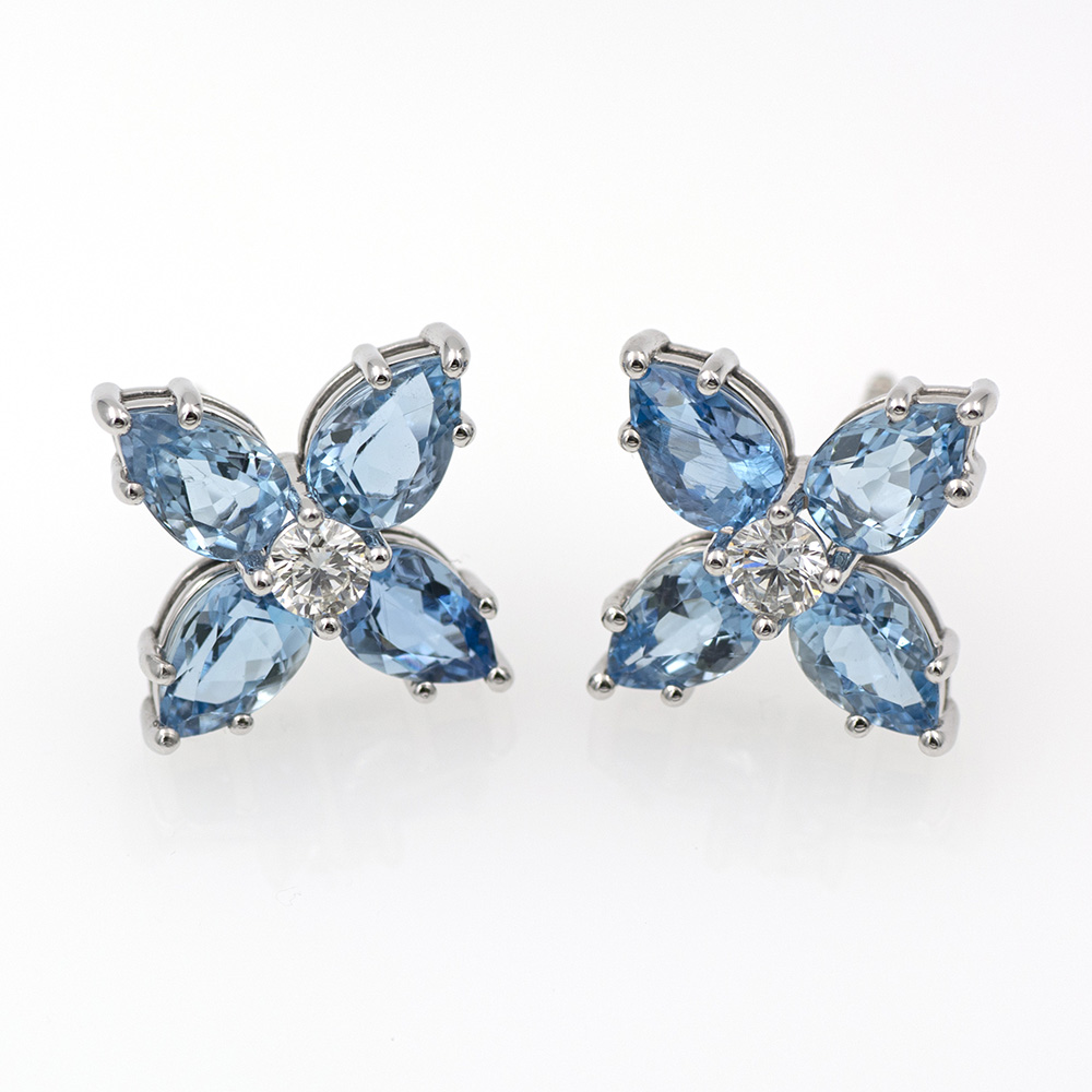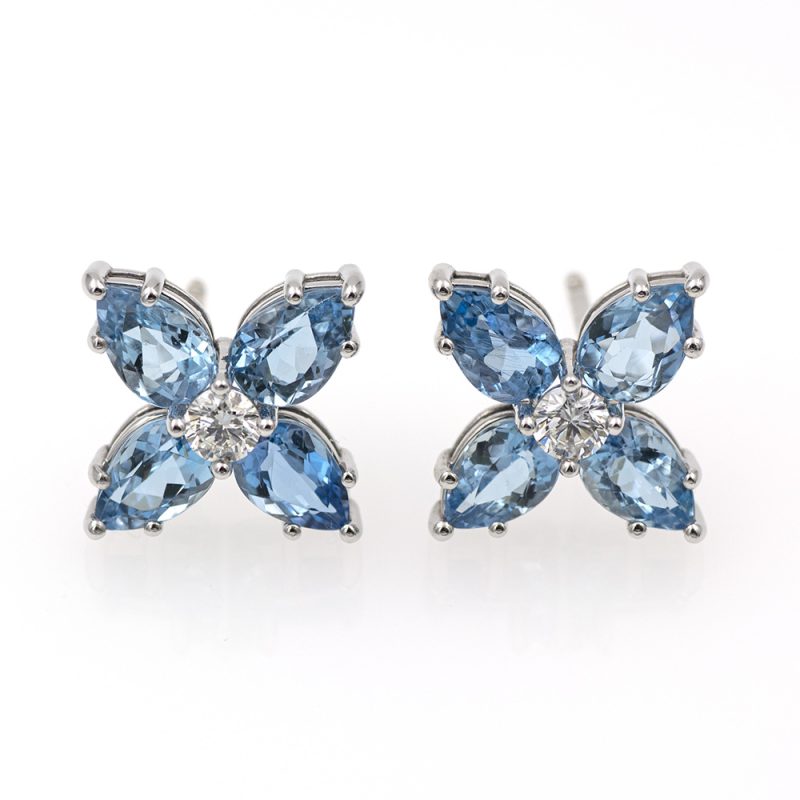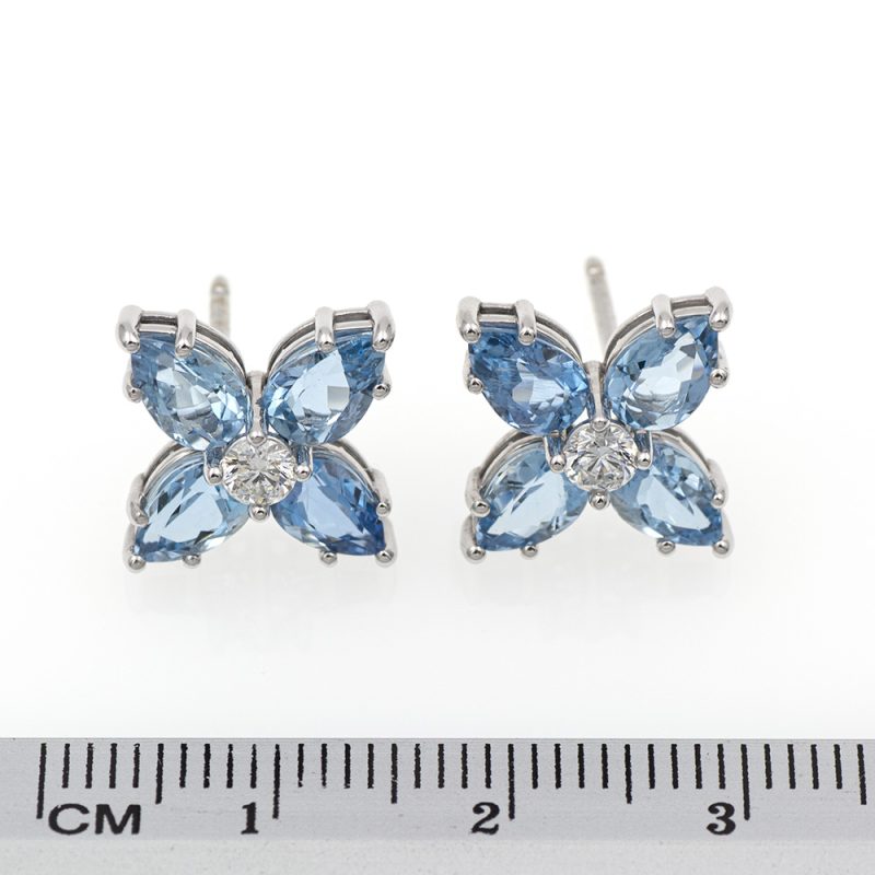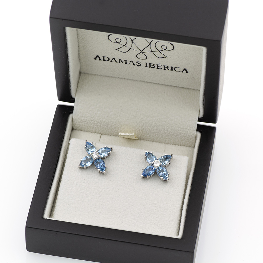 Pendientes en forma de flor de oro blanco con aguamarinas y diamantes.